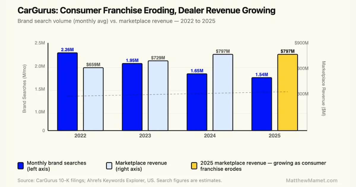 The marketplace revenue growth alongside total revenue decline and brand search decline is the tell: CarGurus is extracting more value per dealer relationship even as the consumer comparison franchise erodes. That is what a business in mid-pivot looks like.