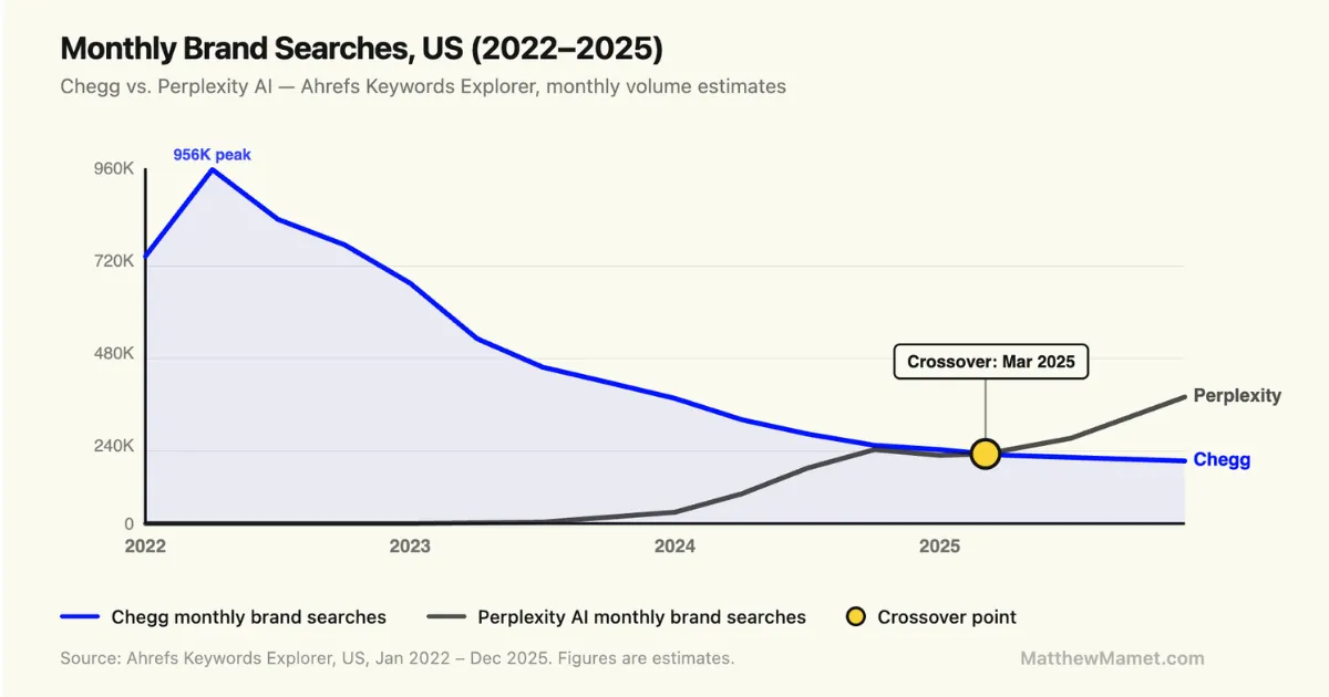 The search data shows what happened to consumer behavior before it showed up in the financials. By the 2023 to 2024 school year, average monthly searches for Chegg had fallen to 405,000, a 44% decline from the 2022 average. In May 2023, Chegg became the first public company to name ChatGPT explicitly as a cause of business deterioration and withdrew its annual guidance. By 2024, the subscriber base had declined to 3.6 million, a 54% drop from peak, and the company posted an $837 million net loss on $617 million in revenue.