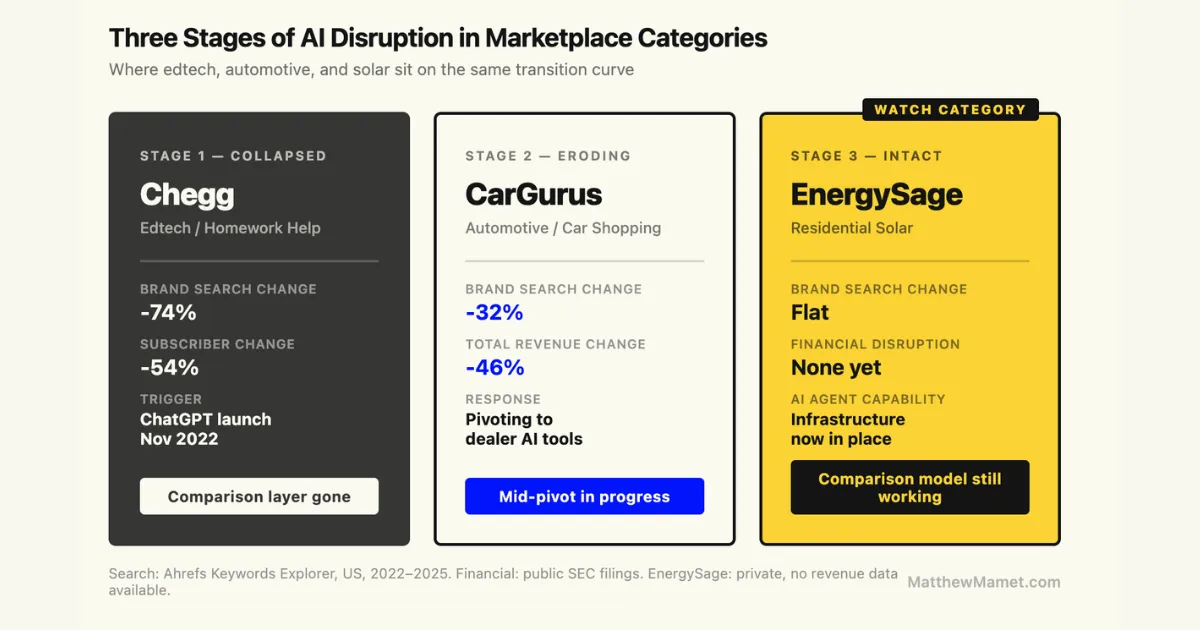 The search volume data suggests the transition has started. EnergySage brand search is declining. But the category is watching two upstream indicators, residential solar installation rates and AI agent adoption for home improvement decisions, that will determine when the comparison layer becomes the bottleneck rather than the enabler.