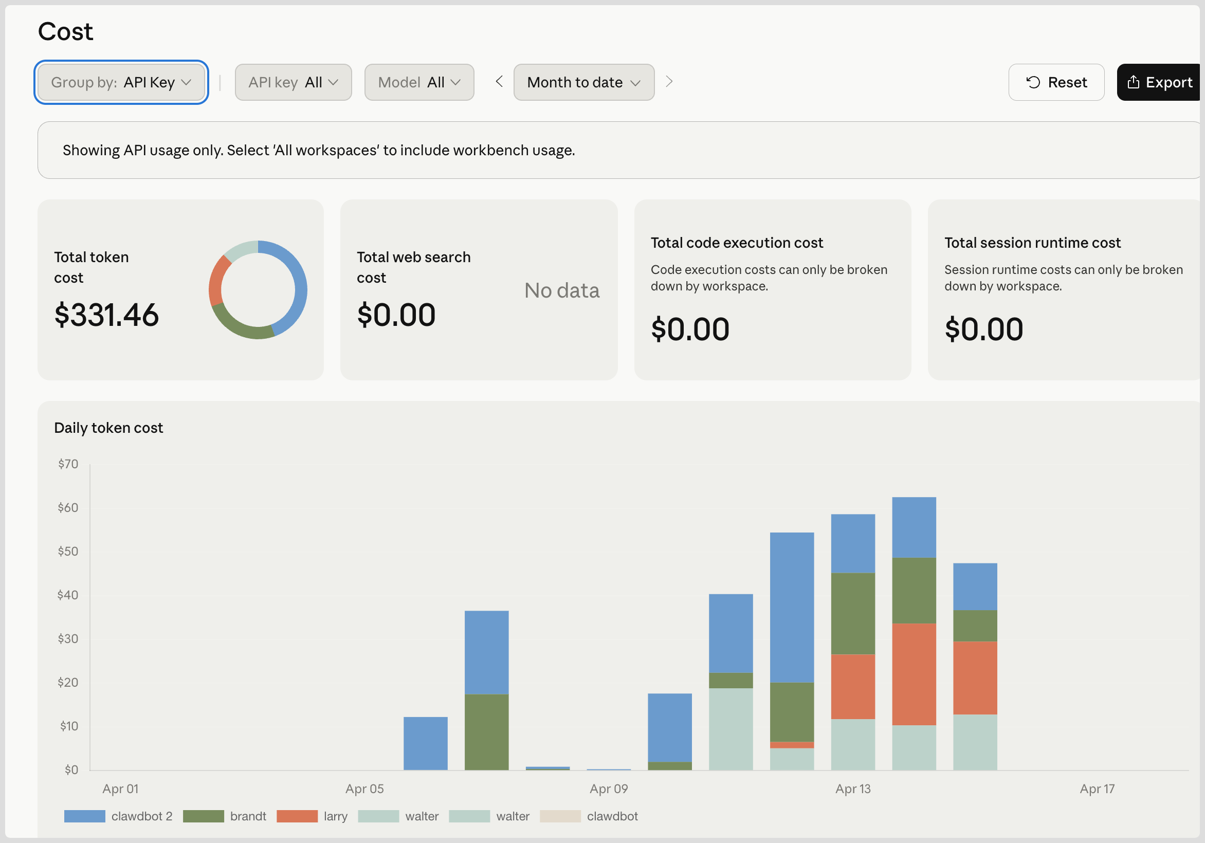 In the first few days, the incomplete stack spent $331 in API costs. Quickly thereafter, monthly run rate grew to over $1000.
