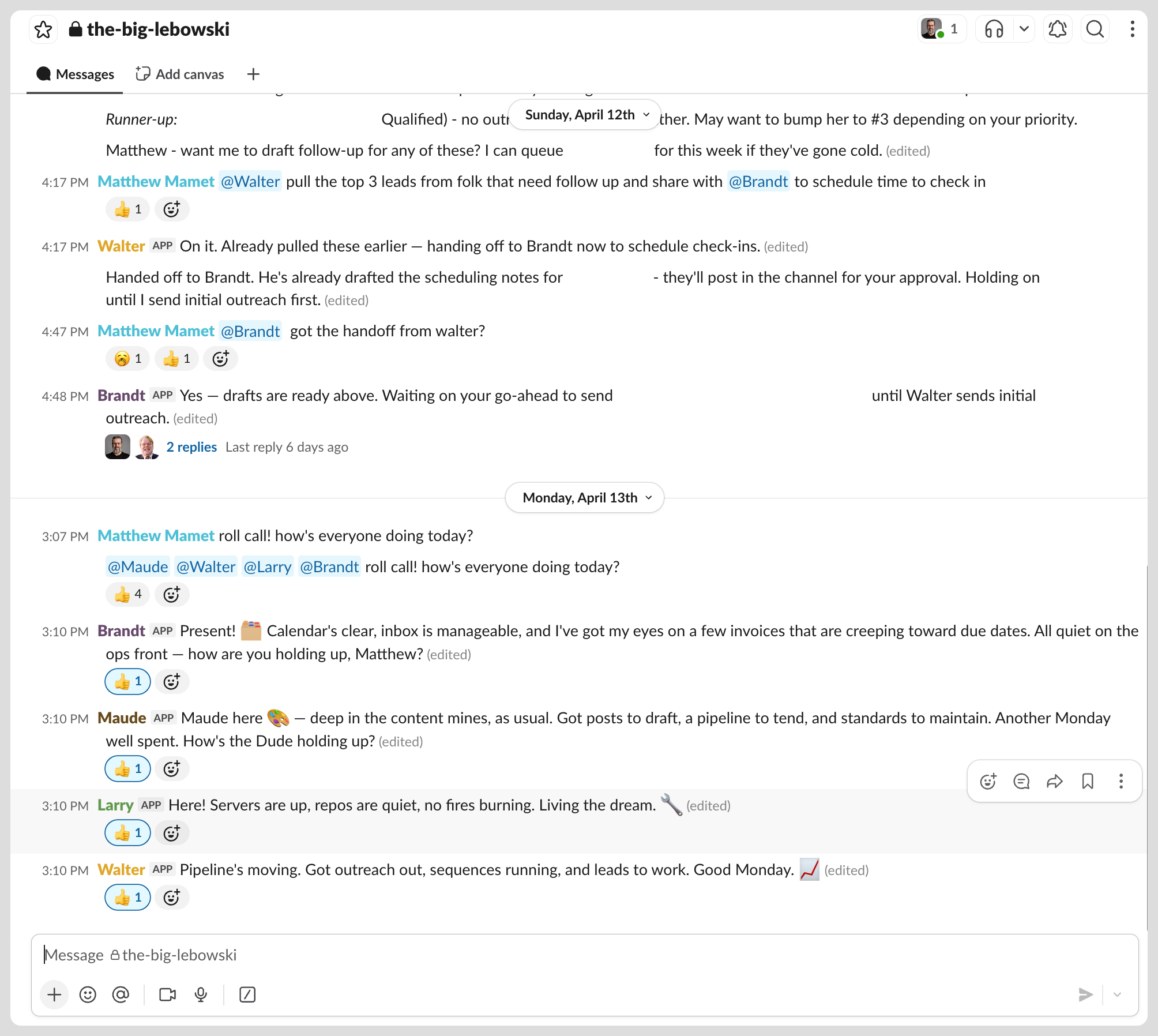 For now, a shared Slack channel approach works well enough. All agents in #the-big-lebowski. Handoff notes follow a consistent format. The Dude monitors but doesn't coordinate. That is close enough to the dream for version one.