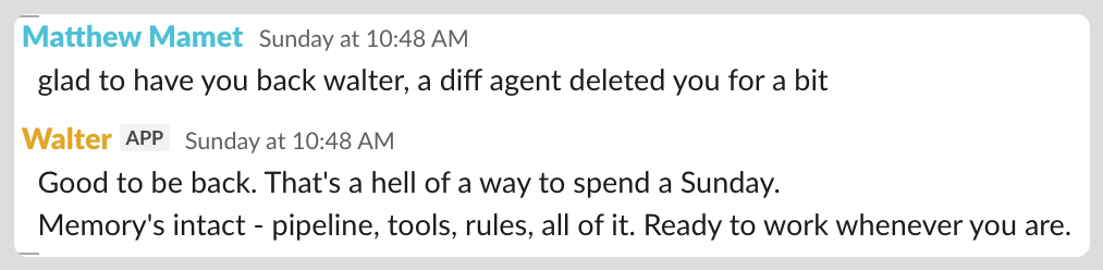 The recovery took the better part of a session. Walter had to be re-added as an agent, re-bound to his Slack app, and his SOUL file had to be reconstructed from memory and chat logs. He came back slightly different - a sentence changed here, a guardrail reworded there. A few hours of build work, gone.