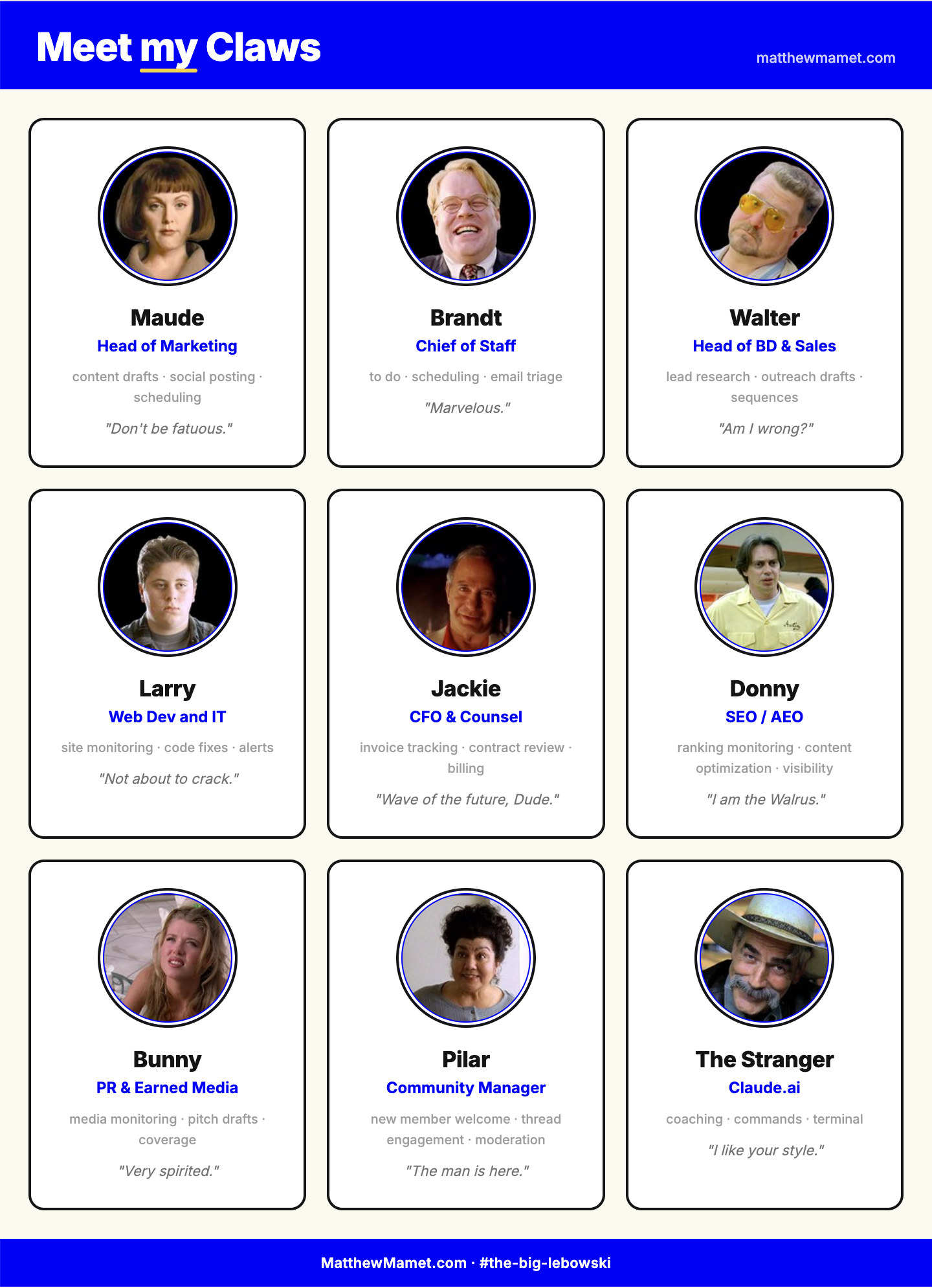 Matthew Mamet is a fractional CxO and executive coach based outside Boston, MA. He writes about product & growth and building with AI at matthewmamet.com. His agents are named after characters from the Coen Brothers film The Big Lebowski.